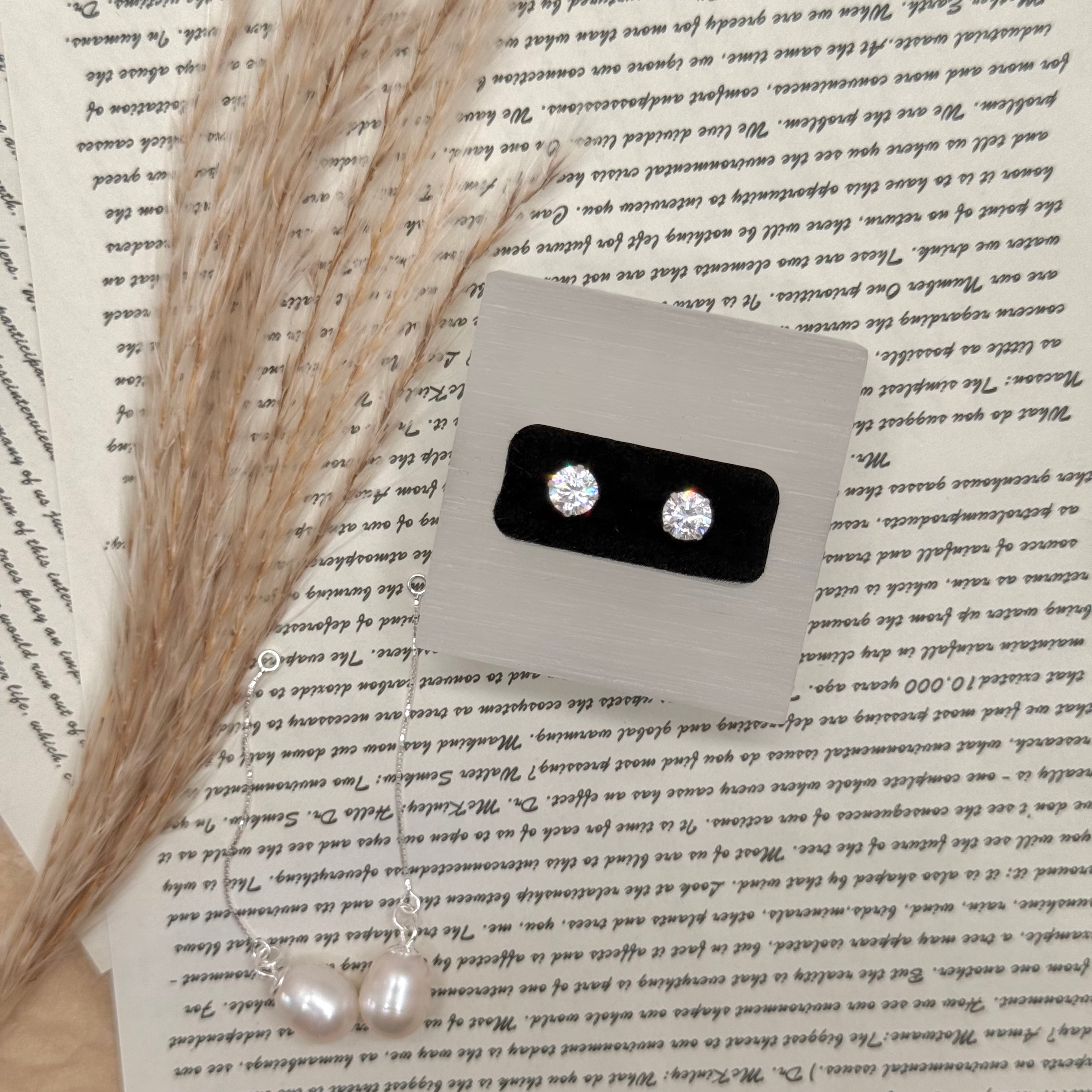 These S925 silver long drop earrings feature shimmering zircon stones paired with natural freshwater pearls. The elongated chain design creates a graceful silhouette, catching the light with every movement. Elegant and refined, they bring a touch of gentle sophistication to any look.