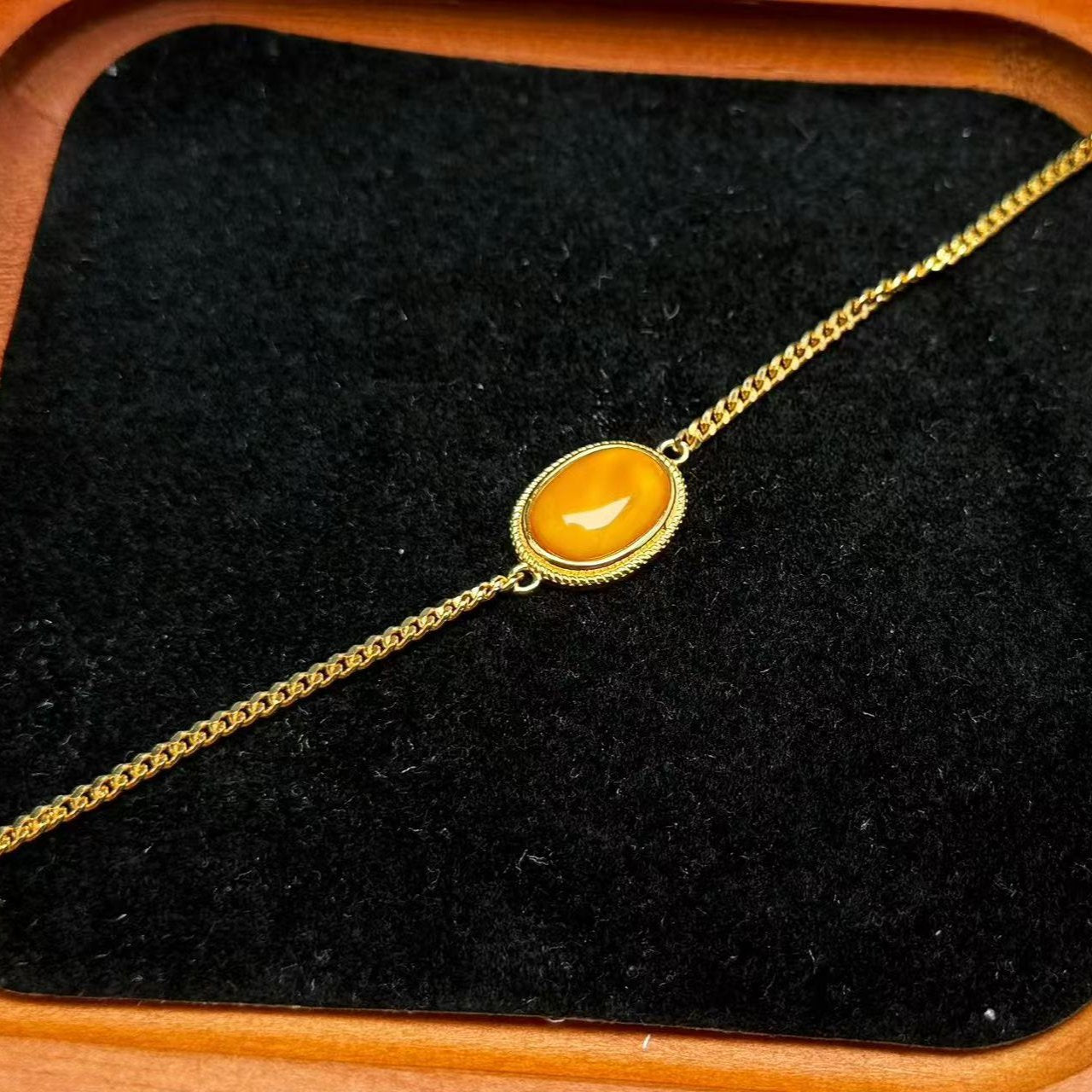 This bracelet features an S925 sterling silver base plated with 18k gold, paired with the warm, alluring glow of amber. The rich golden tones of the amber perfectly complement the 18k gold sheen, adding a subtle yet elegant touch of luxury to the wearer. Ideal for both everyday wear and special occasions.