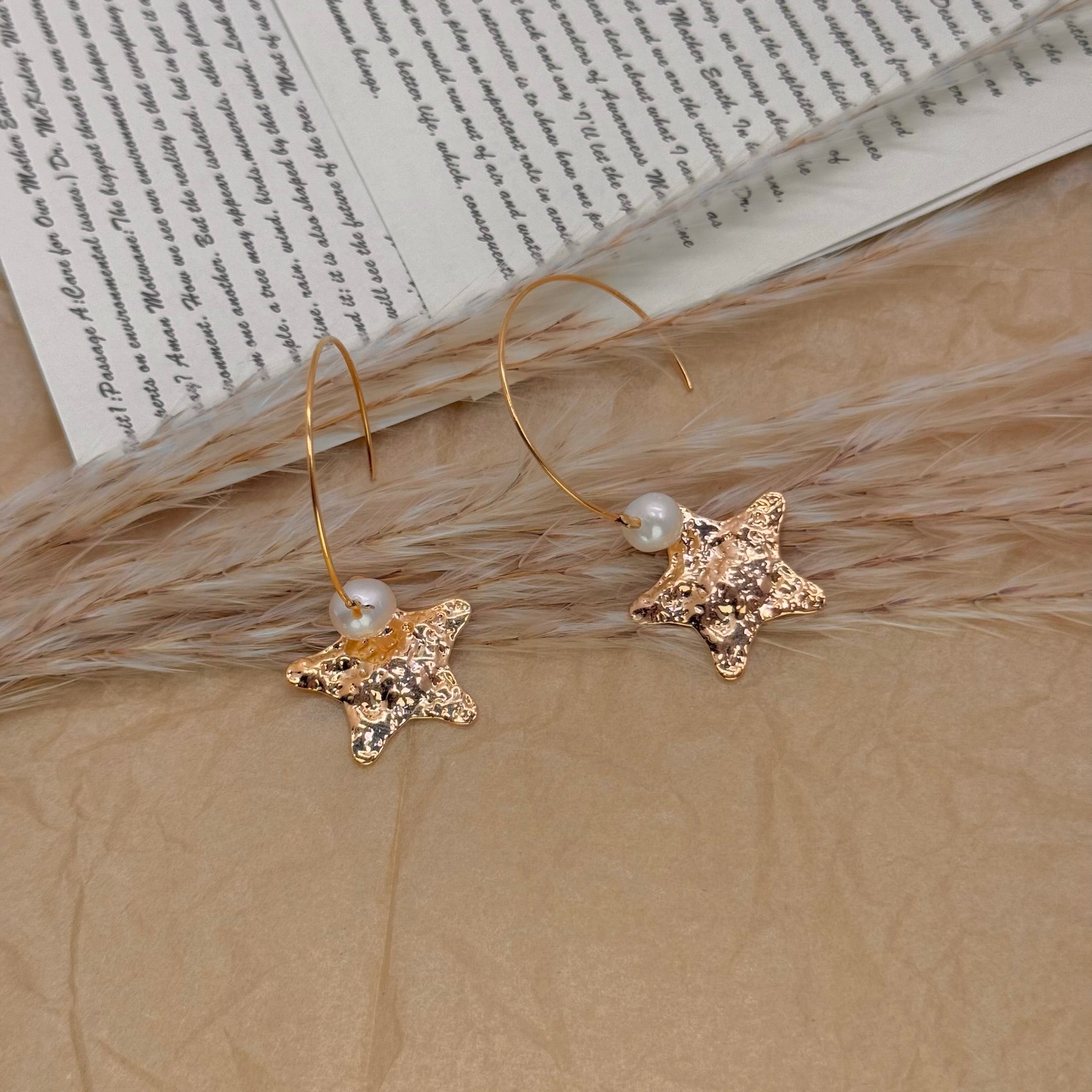 These French-inspired earrings feature a delicate star design paired with elegant pearls, exuding a romantic and playful charm. Plated with 14K gold, the earrings offer a warm, lustrous finish and lightweight comfort, perfect for both everyday wear and special occasions.