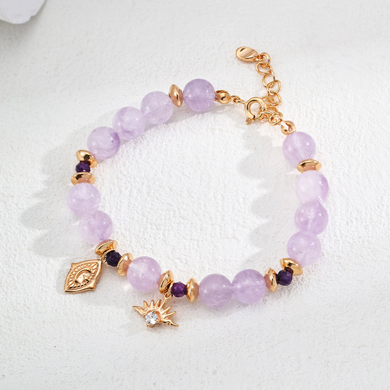 This S925 silver bracelet is plated in gold, featuring lavender-colored amethyst zircon stones in an elegant, soft hue reminiscent of a dreamy lavender field. The sparkling zircon, like morning dew, adds a captivating shine as it delicately wraps around the wrist, bringing a touch of graceful romance to the wearer.