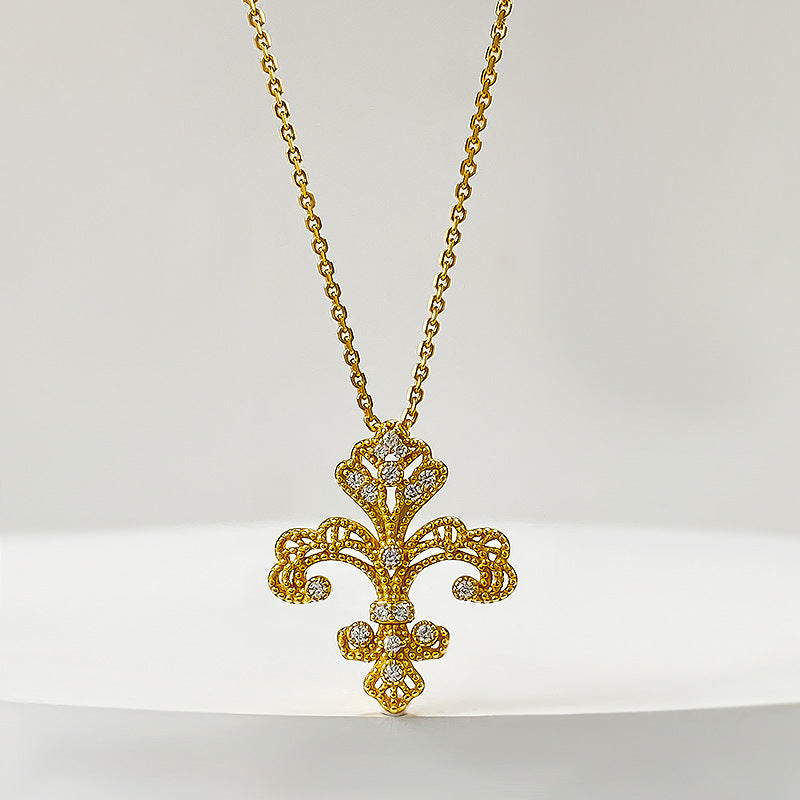 This pendant is crafted from S925 silver with 18K gold plating, exuding a vintage medieval charm. Featuring a classic iris flower design, it embodies natural elegance and distinctive style. The refined golden finish and intricate details make it a timeless piece, perfect for daily wear or adding a touch of sophistication to special occasions.