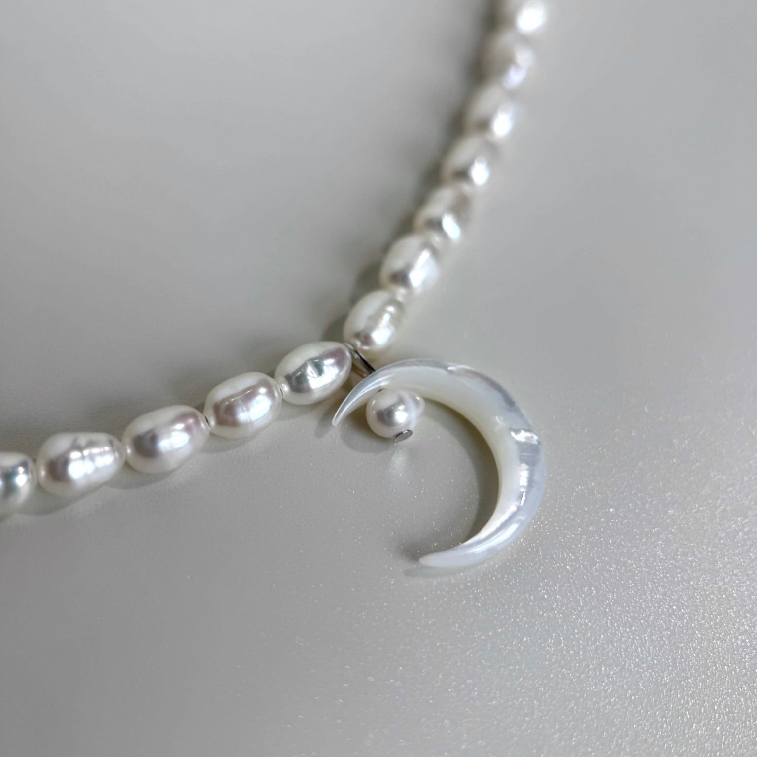 Crafted from S925 silver, this necklace features a crescent moon inlaid with shimmering mother-of-pearl, paired with a natural freshwater pearl. Like moonlight drifting through the night sky, it brings a soft, serene glow—perfect for those who cherish elegance and nature’s quiet beauty.