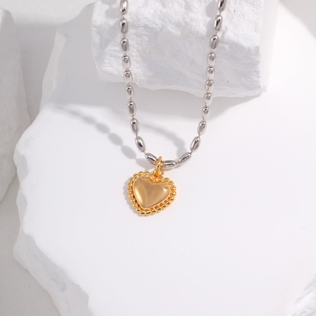This necklace is crafted from S925 sterling silver, adorned with delicate silver beads along the chain, and features a gold-plated heart pendant. Its refined design blends modernity with elegance, adding a touch of warmth and romance to everyday wear.