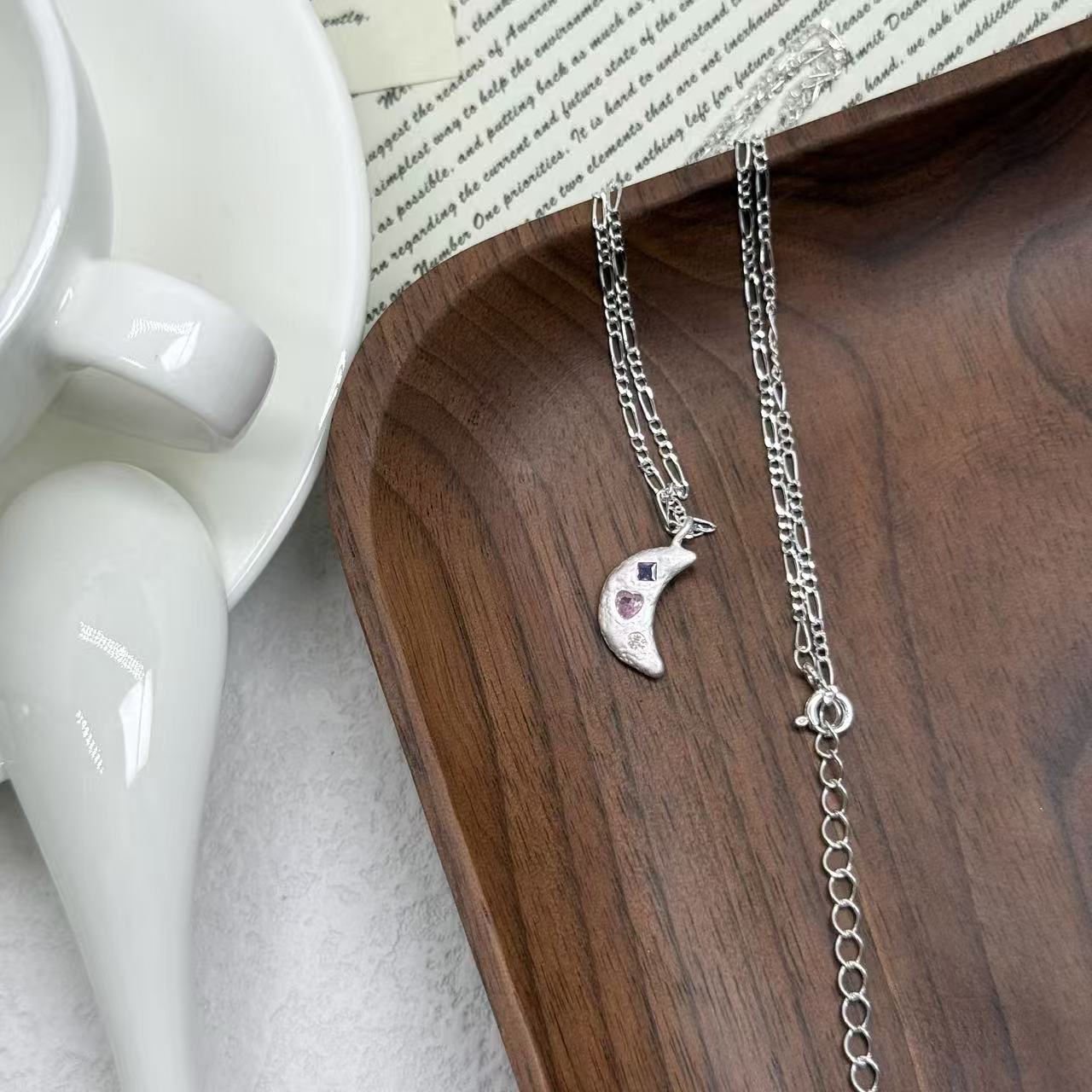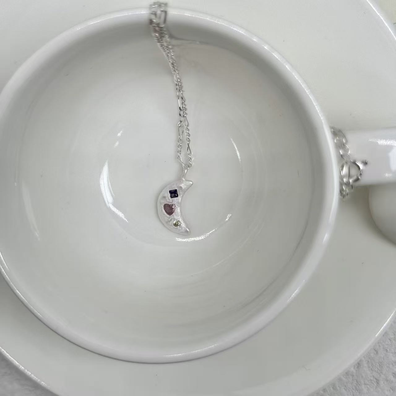 Inspired by the moon, this S925 silver necklace features a brushed finish for a soft, refined sheen. The pendant is adorned with colorful zircon stones that sparkle like scattered starlight across the moon’s surface. With its minimalist yet dreamy design, this piece brings a gentle radiance to any outfit—beautiful on its own or layered with other necklaces.