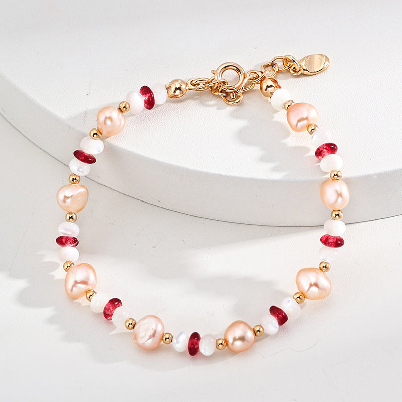 Crafted from S925 sterling silver, this bracelet combines natural pearls, lustrous mother-of-pearl, and vibrant rubies. Its delicate design merges the gentle beauty of nature with the brilliance of gemstones, exuding a subtle yet captivating elegance. Perfect for both everyday wear and special occasions, this bracelet is a timeless addition to any jewelry collection.