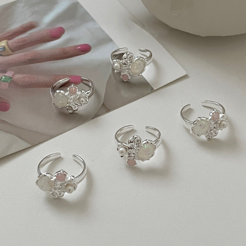 This exquisite ring, crafted from S925 silver, features a radiant pink opal as the centerpiece, symbolizing sweetness and softness. Accentuated by the ethereal glow of moonstone and the timeless elegance of natural pearls, it weaves a delicate harmony of beauty. With its simple yet sophisticated design, this ring is perfect for any style, adding a touch of romance and charm to the wearer.