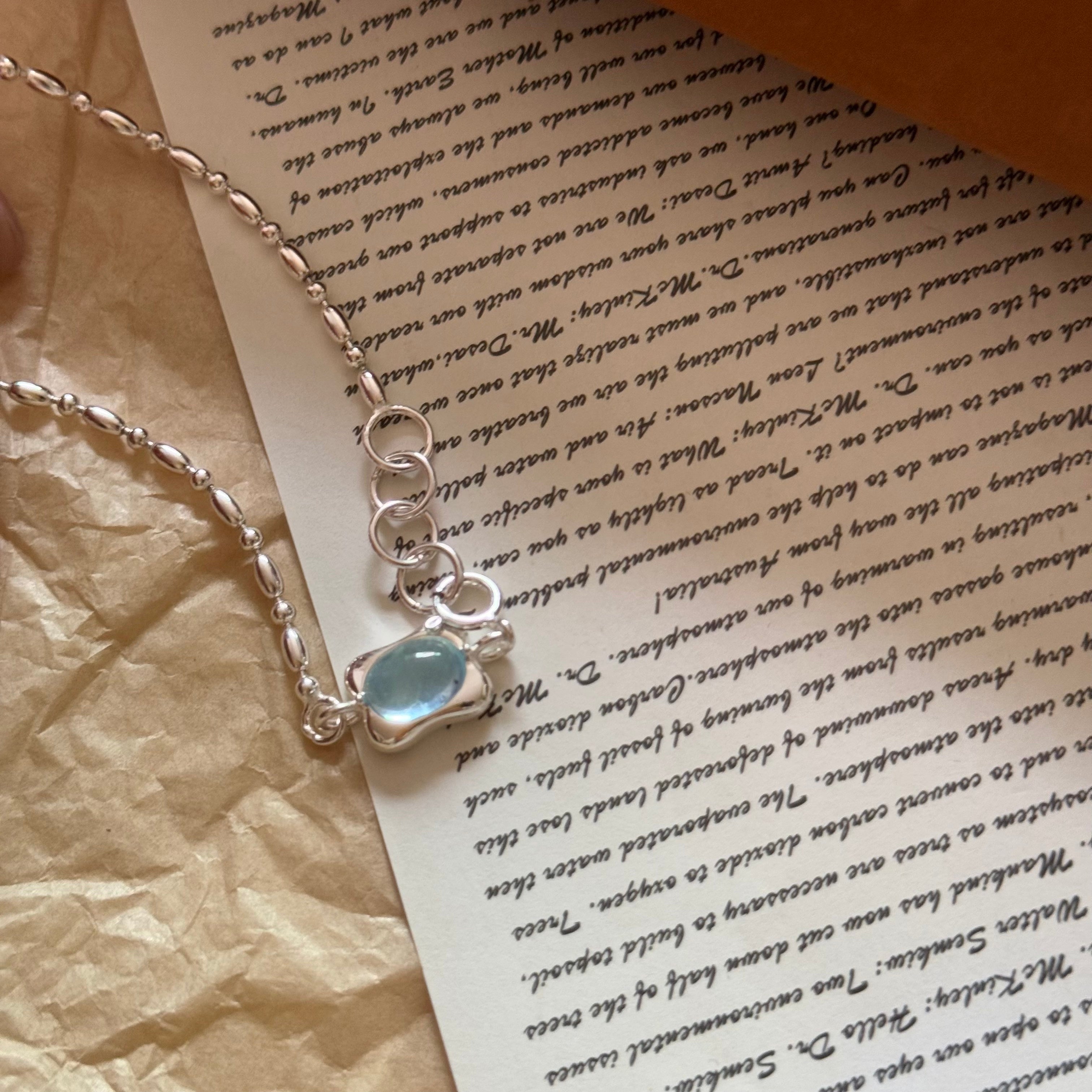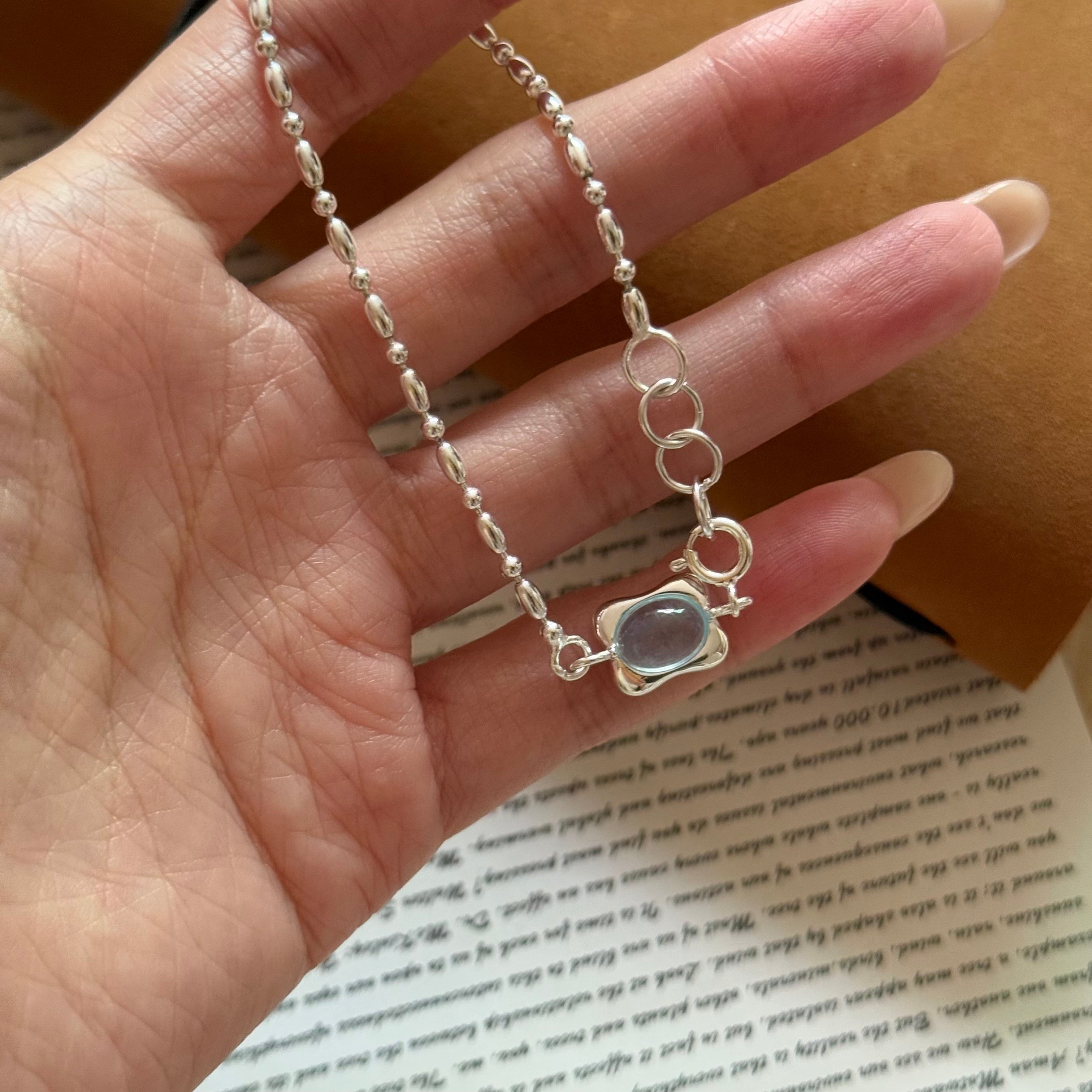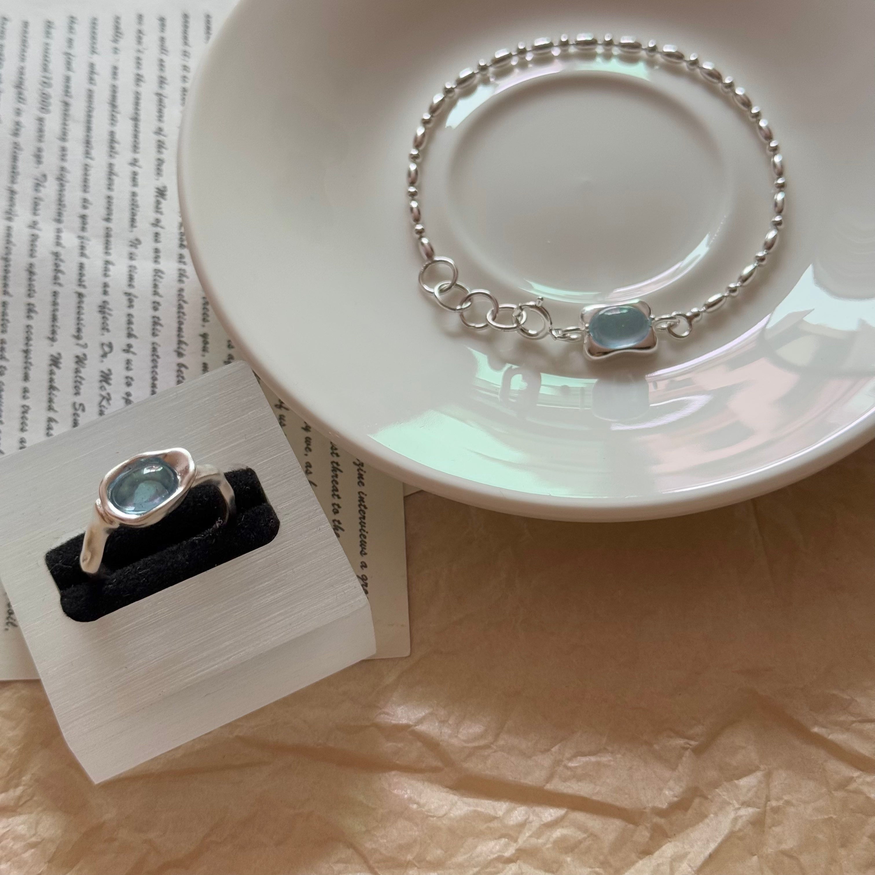 Crafted from S925 sterling silver, this bracelet and ring set features natural aquamarine finished with a vintage frosted technique, creating a soft, misty glow. The serene blue tones evoke moonlit ocean waters, offering a calm and refined elegance. With its understated design and delicate texture, this set is perfect for everyday wear—beautiful worn alone or styled together for a cohesive look.