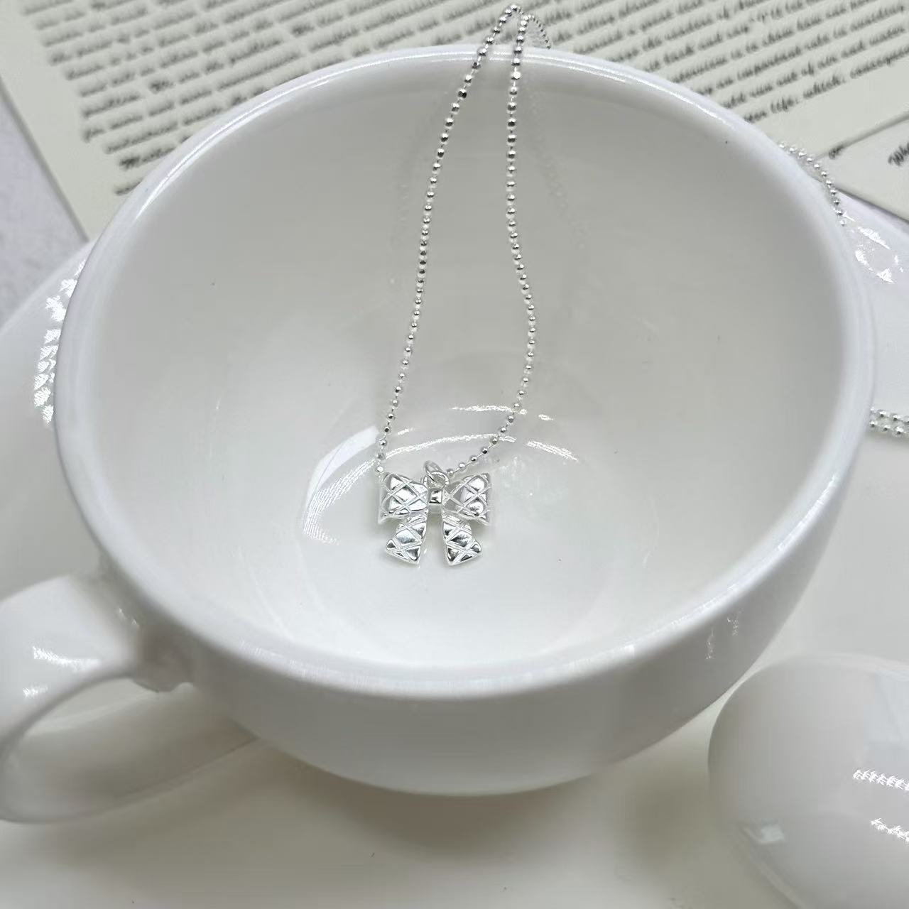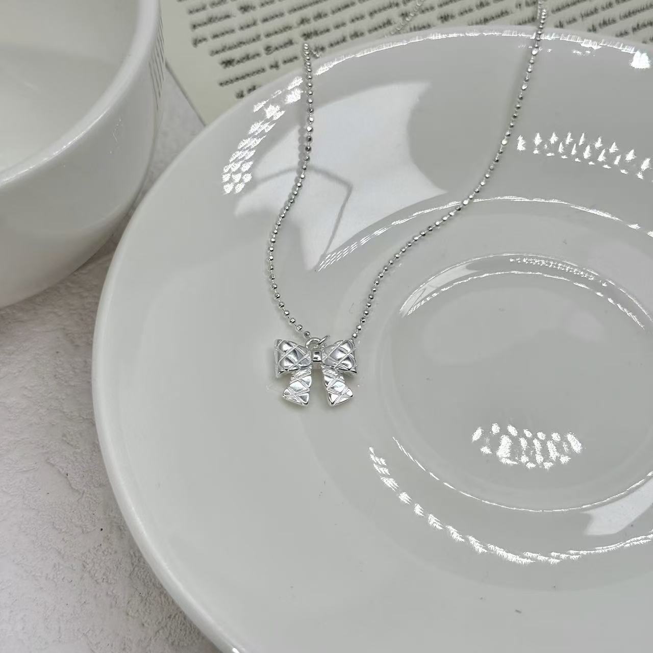 This S925 silver necklace features a delicate bow design with a refined waffle texture, creating a subtle play of light and shadow. The gentle silver sheen and graceful lines blend elegance with a touch of sweetness, making it perfect for both everyday wear and special occasions.