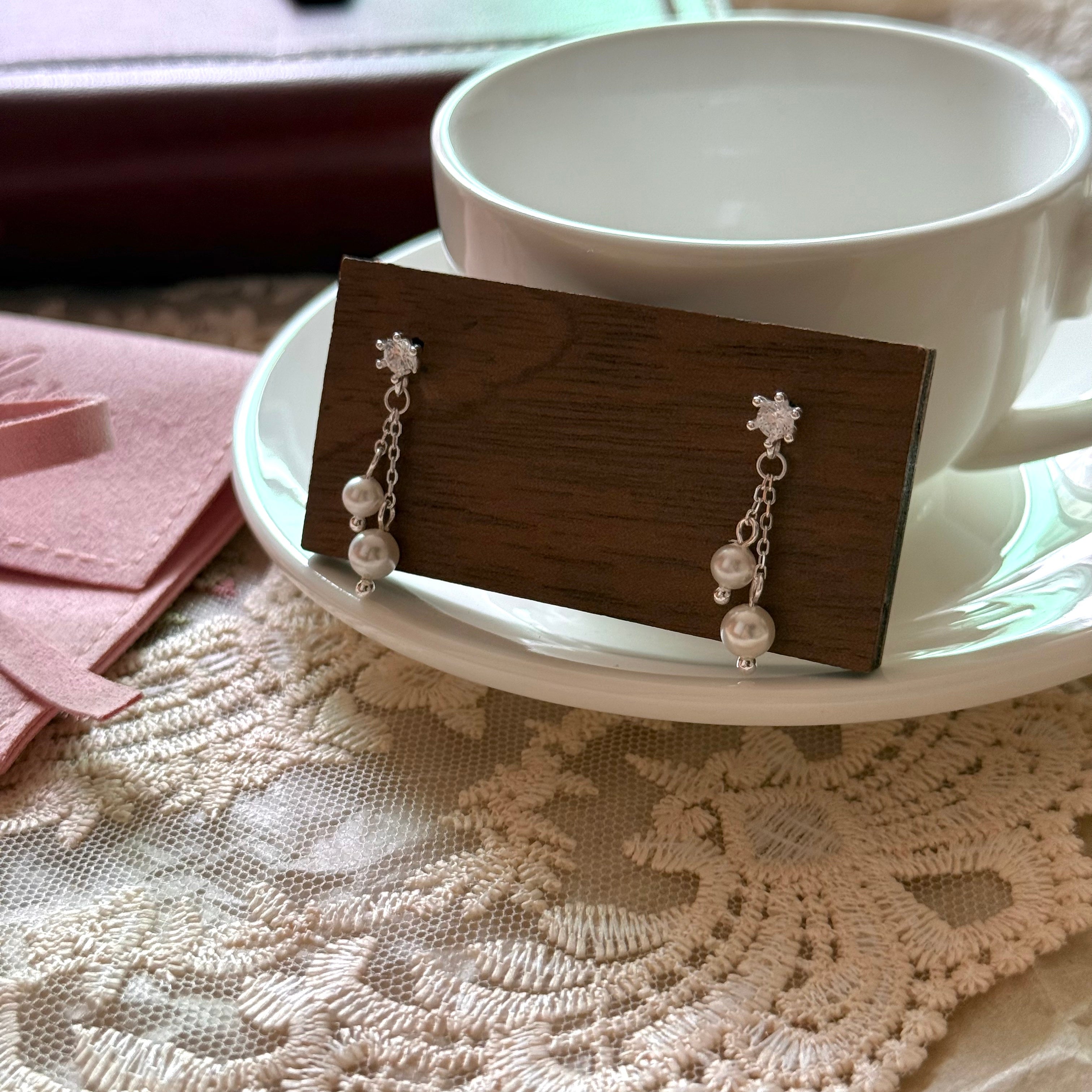 Crafted from S925 sterling silver, these stud earrings feature a layered zircon design with delicate tassel details and a natural pearl accent. The sparkling stones catch the light beautifully, while the subtle movement of the tassel adds a graceful, feminine touch. Balanced by the soft luster of the pearl, this piece feels elegant yet wearable—perfect for elevating everyday looks or adding refinement to special occasions.