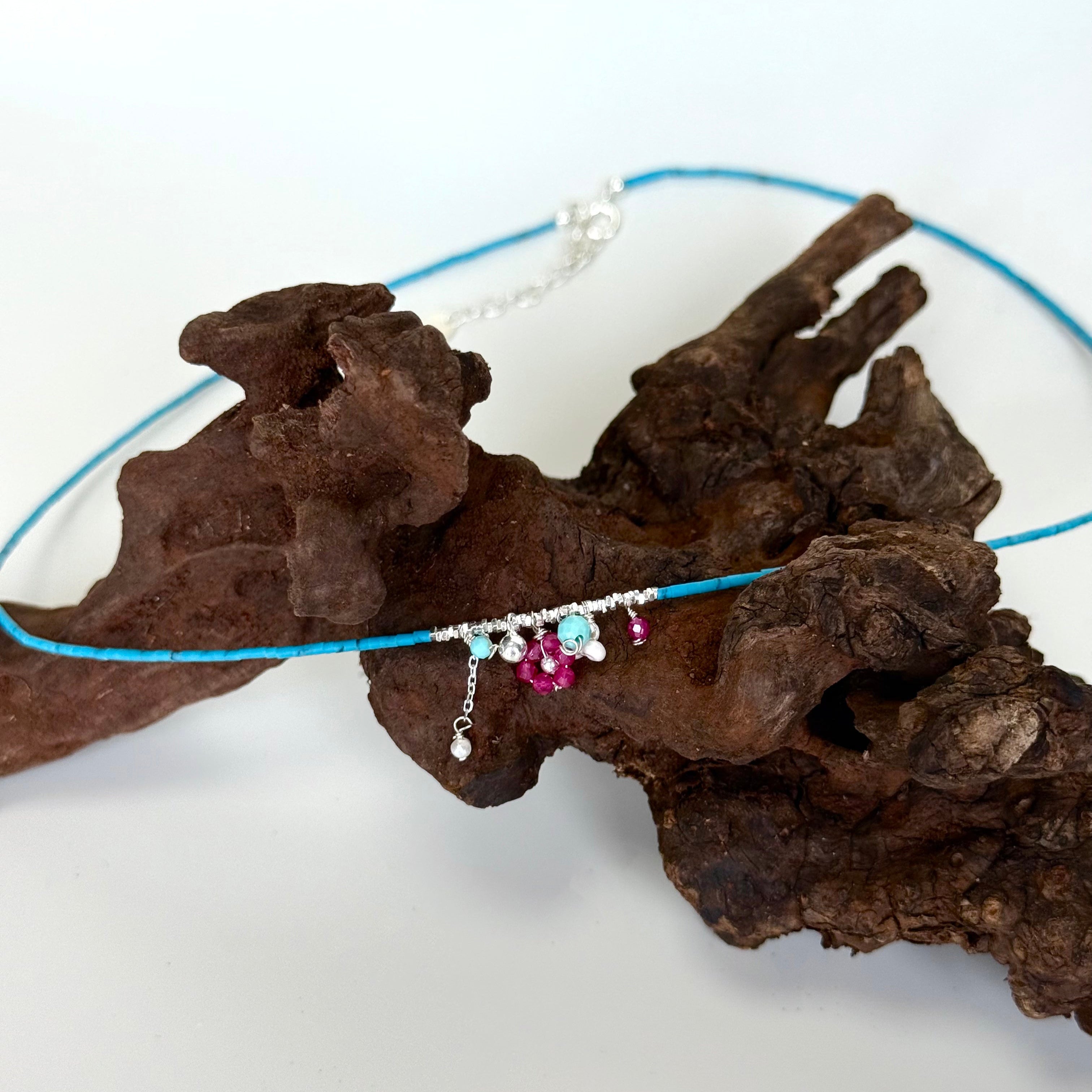This necklace combines natural turquoise, ruby, and pearl beads with irregular S925 silver fragments. Vivid in color yet harmoniously balanced, each stone reveals unique textures, reflecting the beauty of nature and handcrafted artistry. A striking blend of boldness and grace.